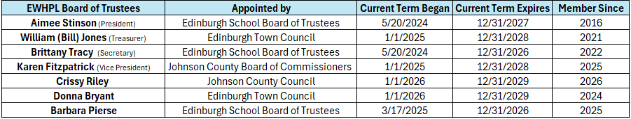 The Edinburgh Wright Hageman Public Library Board of Trustees will meet on the 2nd Tuesday of each month in 2026 at 6pm at the library facility located at: