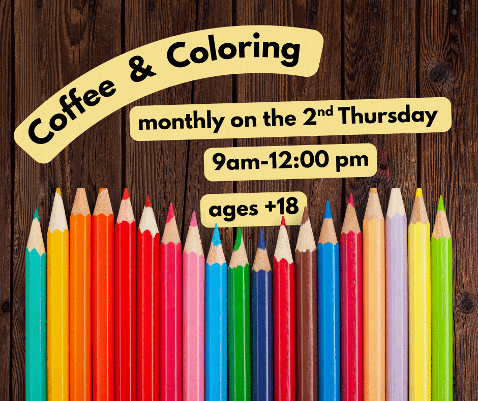 Join us for this relaxing event on the second Thursday of every month. Stop in anytime from 9am – 12pm. All coloring sheets and materials provided and refreshments are included.